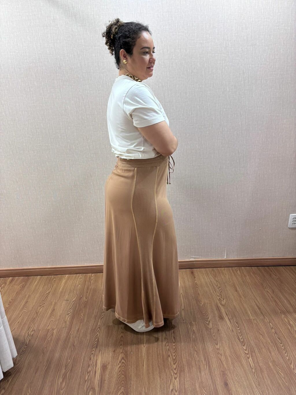 Essa saia longa une conforto e sofisticação com seu design fluido e moderno. O detalhe canelado nas laterais adiciona textura e estilo à peça, enquanto o elástico na cintura com cordão para amarração garante ajuste perfeito e praticidade. Ideal para composições elegantes e descontraídas, ela oferece leveza com um toque de estrutura.